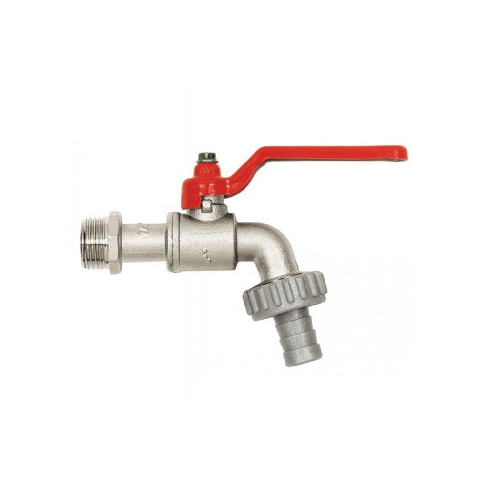 -Кран шаровой 1/2" водоразборный со штуцером резьба наружная рукоятка флажкового типа производится из никелированной латуни, оснащен стальной травмобезопасной рукоятью.