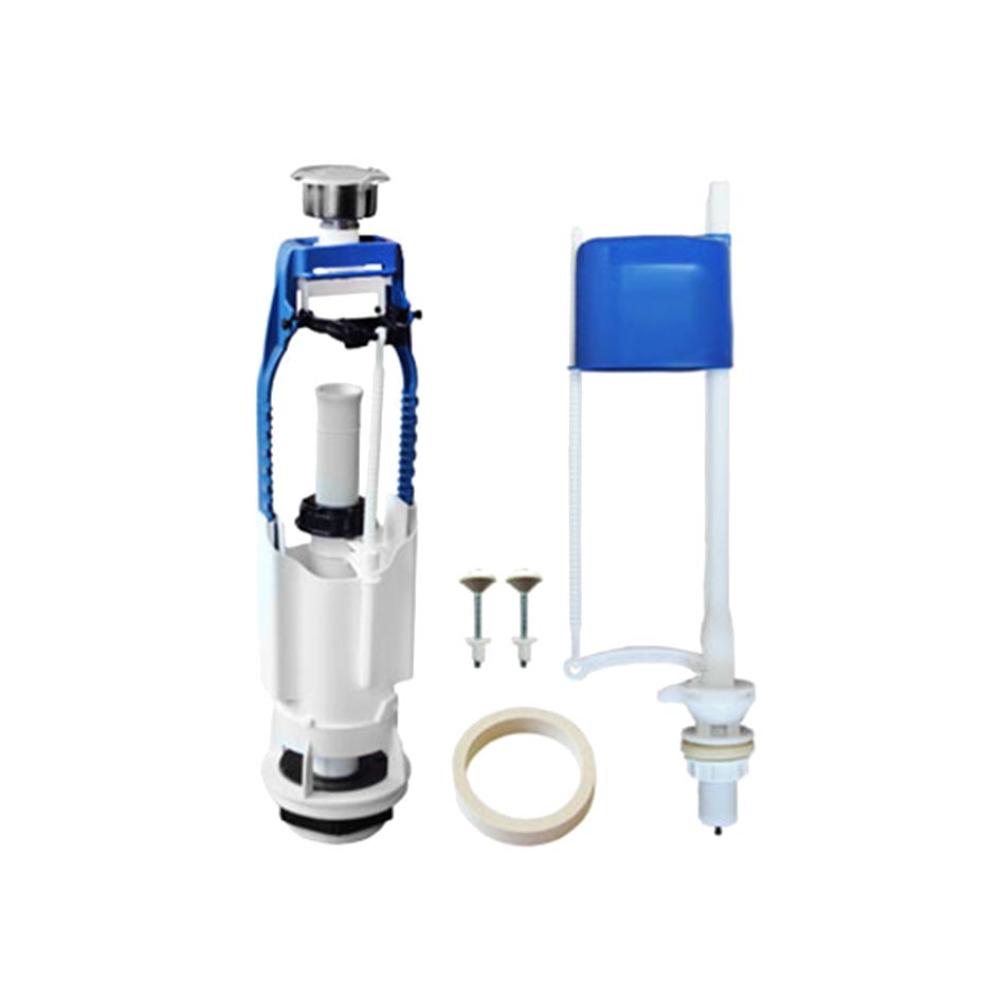 Комплект: наполнительный клапан КН 55.00.00 с нижней подводкой воды, двухуровневый спускной клапан АСД 77.00.00 с металлизированной или пластиковой кнопкой, комплект крепежа, прокладка между бачком и унитазом, инструкция по установке.