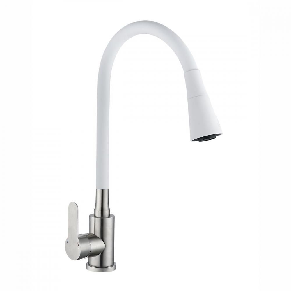 Смеситель для кухни с гибким изливом, серия Садко, АНТЕЙ - Материал: нержавеющая сталь (SUS304) - Вес смесителя: 1,220 кг - Цвет: сатин + белый - Картридж: o35мм, пластиковая с керамическими пластинами, WANHAI - Излив: поворотный, высокий, гибкий - Аэратор: пластиковый, съемный, 2-х режимный - Крепление: FAST FIX (гайка) из 201 стали В комплекте: гибкая подводка 35см (2шт.), крепление, декоративная подставка под смеситель (1шт.), резиновая прокладка (1шт.), резиновое уплотнительное кольцо (1шт.), пластиковая шайба (1шт.), паспорт смесителя (1 шт.)