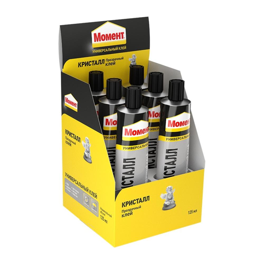 Клей Кристалл Момент - прозрачный клей, не оставляющий заметных следов. Предназначен для работы с материалами из мягкого и жёсткого поливинилхлорида, полистирола, оргстекла и других пластиков. В различных сочетаниях склеивает дерево, металл, резину, бумагу, картон, кожу, ткань, пробку, поролон, фарфор, керамику, стекло, кроме посуды, контактирующей с пищей.