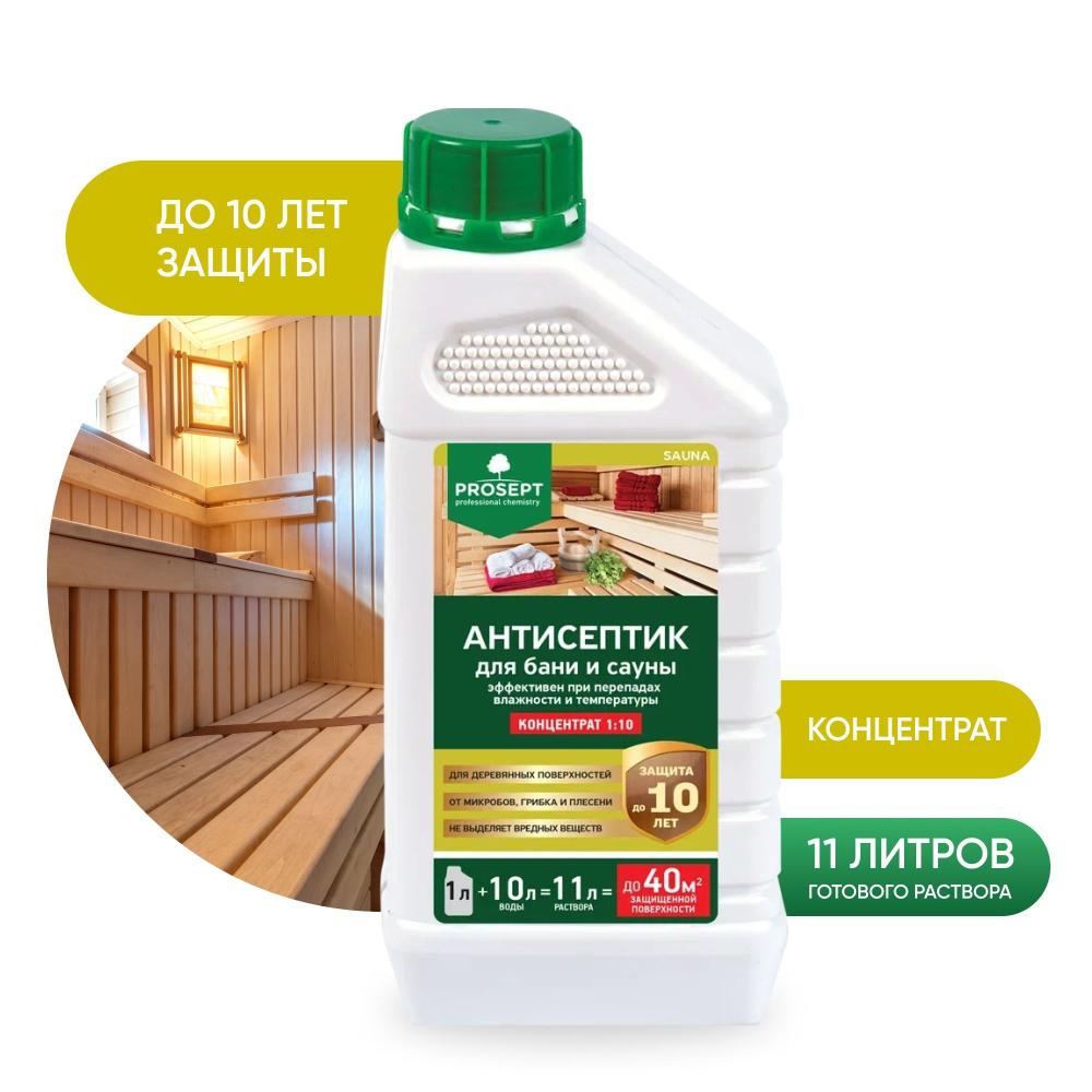 PROSEPT SAUNA – антисептик на водной основе для бань и саун. Предназначен для защиты древесины от действия дереворазрушающих и деревоокрашивающих плесневых грибов в саунах, парных, моечных и прилегающих к ним помещениях. Содержит компонент, предотвращающий развитие болезнетворных микробов, спор грибков. Обеспечивает надежную защиту при циклическом увлажнении и перепадах температур.