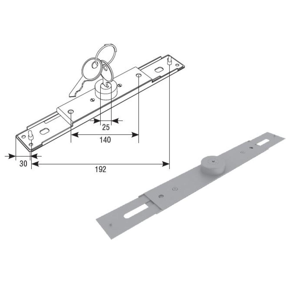 Для профилей RA42E, RA45EN, RA50EM. Замок с двухсторонним управлением, состоит из центральной части, 2 ключей и монтажного крепежа для установки в концевой профиль.