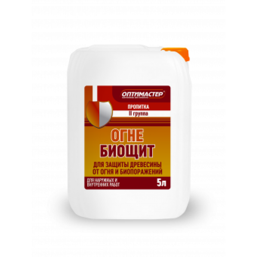 Огнебиощит бесцветный IIгр ТМ "ОПТИМАСТЕР" представляет собой водный раствор высококачественных антисептических, биоцидных компонентов антипирена и технологических добавок. Не изменяет декоративные свойства материалов после нанесения. Высокая степень защиты в течение 5-7 лет. Рекомендуется применять для получения трудновоспламеняемой древесины и защиты деревянных сооружений от гниения, воздействия биоразрушителей, появления синевы. Обработанная древесина соответствует II группе пожароопасности.