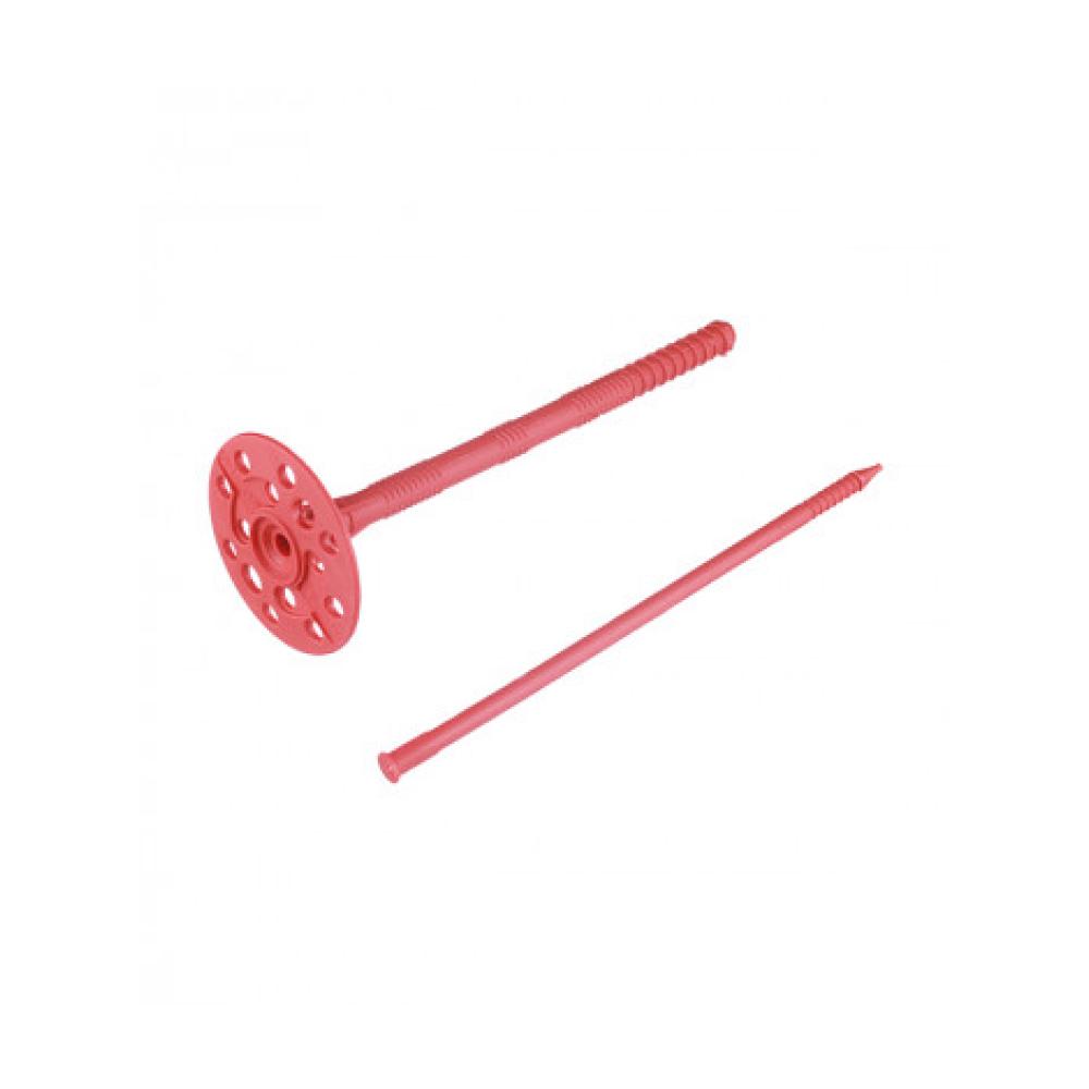 Тарельчатый дюбель можно визуально разделить на три условные части – шляпку, рядовой зонд стрежня и распорную зону. Отличительной чертой шляпки тарельчатого дюбеля является ширина диаметром от 45 до 100 мм. Это конструктивное решение позволяет надежно фиксировать утеплитель к фасаду здания. Шляпка имеет шероховатую поверхность и снабжена конусообразными технологическими отверстиями для повышения сцепления с утеплителем. Под шляпкой идет рядовая зона стрежня, заканчивающейся распорной зоной, которая отвечает за крепление всей теплоизоляционной системы к фасаду и состоит из нескольких секций. Длина секции зависит от размеров самого тарельчатого дюбеля и составляет в среднем 60 мм. В состав тарельчатого дюбеля также входит распорный гвоздь или шуруп, который фиксирует дюбель за счет расширения распорной зоны.
