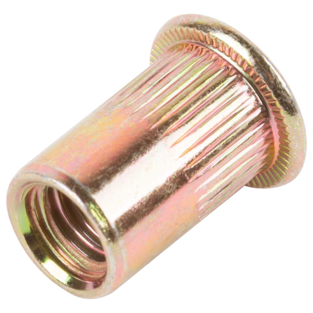 Стальная резьбовая заклепка с насечками и стандартным цилиндрическим бортиком, покрытие цинк. Применяются для скрепления тонколистовых материалов с получением в точке скрепления внутренней резьбы и последующего монтажа прикрепляемого материала. Упаковка: п/э пакет с подвесом.