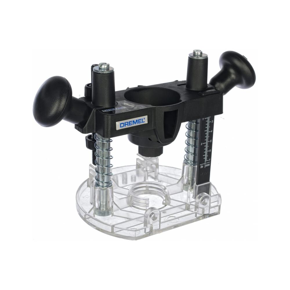 Приставка для фрезерования Dremel 26150335JA применяется для граверов. С помощью нее инструменту можно придать функцию фрезерного станка, способного гравировать по окружности, фрезеровать параллельно кромке, производить декоративные кромки. Для этого имеются направляющая кромки и направляющая окружности. Есть возможность выполнять инкрустацию и гравировать символы, для чего используется комплект направляющих втулок. Данный прибор очень удобен в эксплуатации. Чтобы произвести блокировку или разблокировку, необходимо просто повернуть рукоятку. Также для удобства регулировки имеются два ограничителя глубины.