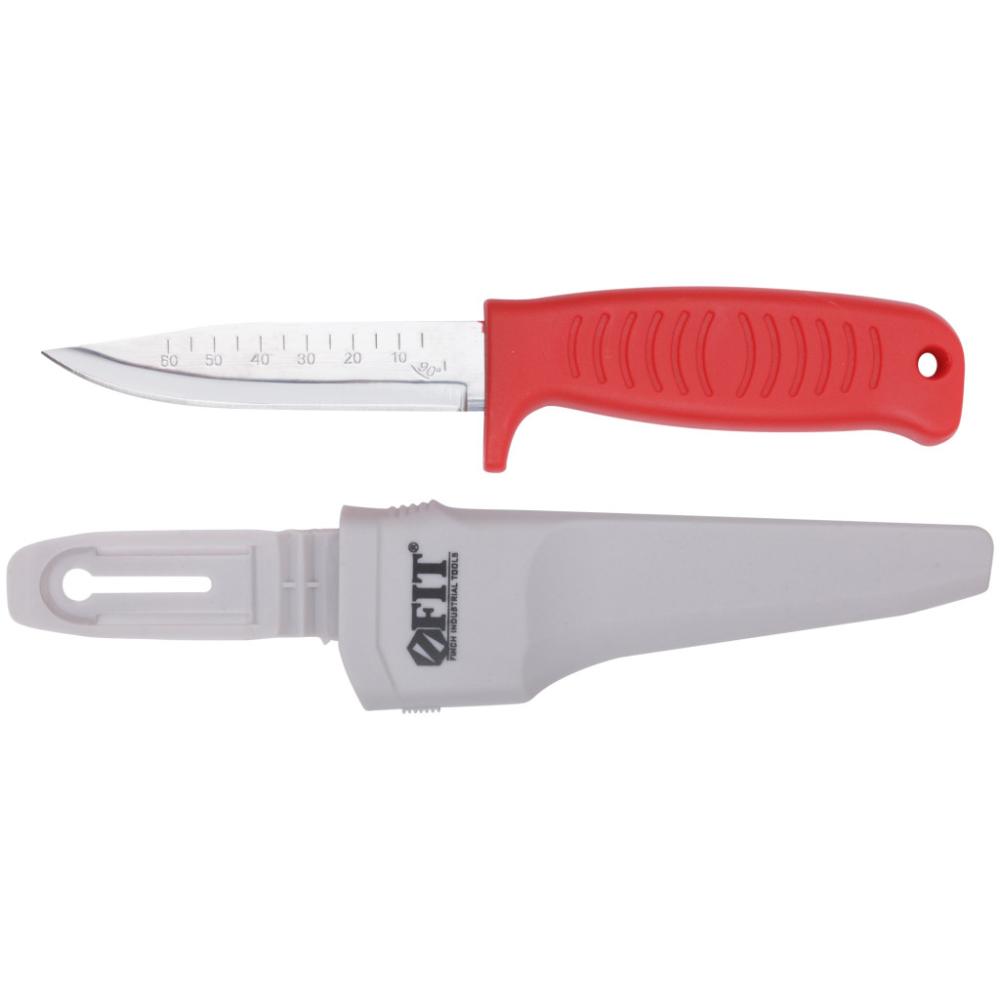 Строительный нож FIT – универсальный инструмент для ремонтных и хозяйственных работ. Также может использоваться в походе и для решения бытовых задач. Лезвие выполнено из нержавеющей стали, что обеспечивает его остроту и прочность. Эргономичная рукоятка изготовлена из пластика, на рукоятке есть рельефные бороздки для надежного удержания в руке. На конце рукоятки отверстие для подвешивания. В комплекте поставляются пластиковые ножны, позволяющие вешать нож на ремень. На лезвие нанесена линейка.