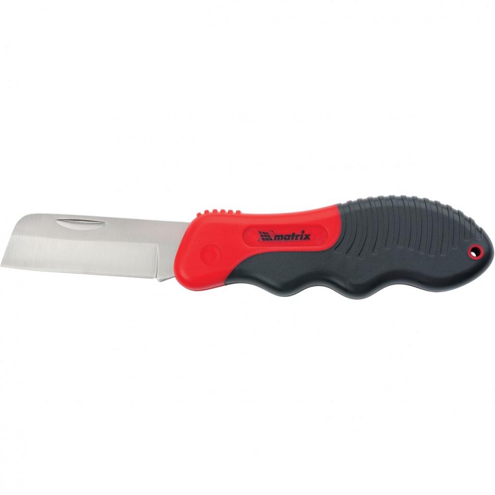 Складной нож электрика Matrix 78987 с прямым лезвием и эргономичной двухкомпонентной рукояткой используется для рассечения проводов и снятия с них изоляции. Прямое лезвие длиной 60 мм удобно для работы в стесненных условиях. Инструмент предназначен для электромонтажных работ, подходит для бытового применения.
