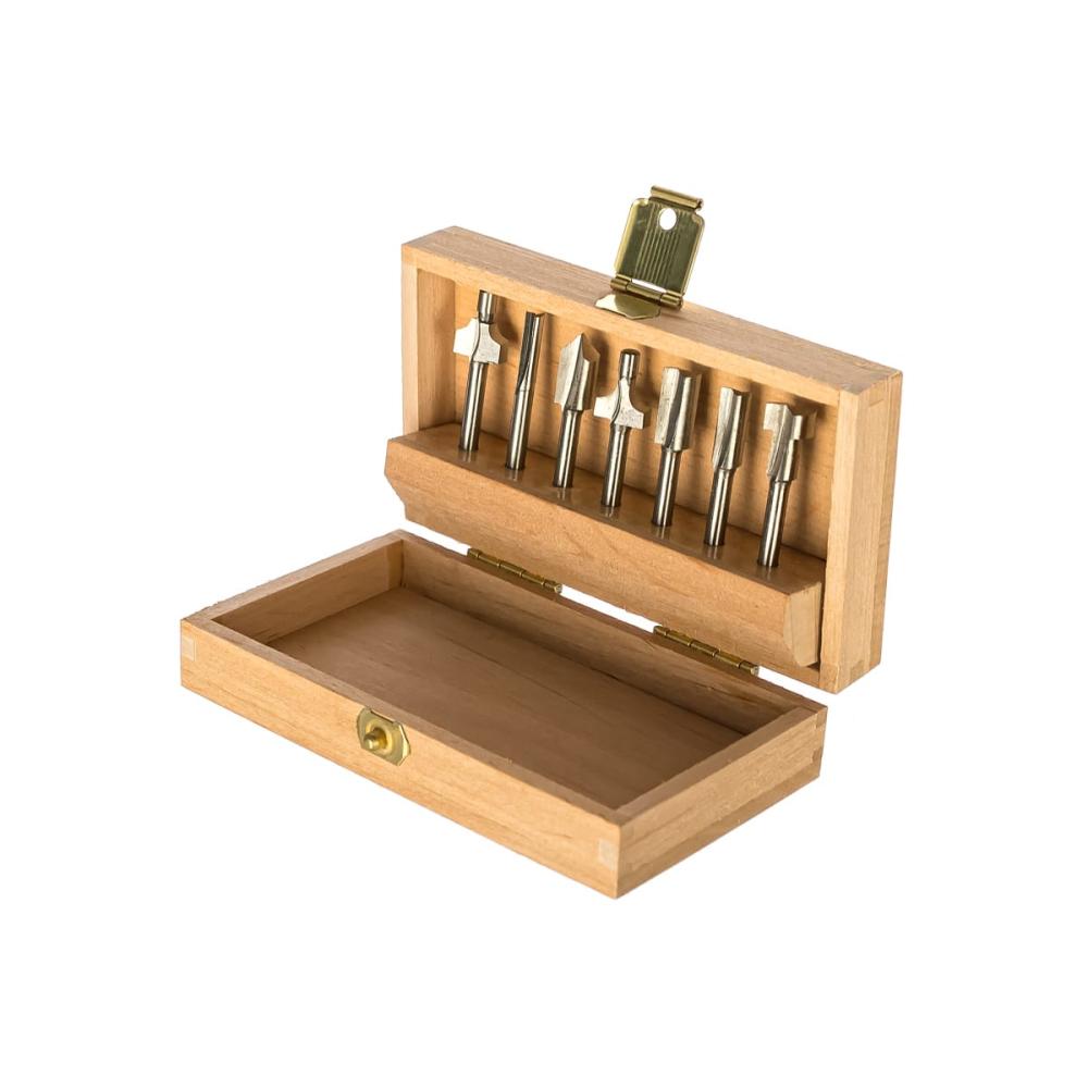 Набор фрез (7 шт.) Dremel 26150660JA применяется для фрезерования по дереву. В набор входят насадки, предназначенные для зенковки, фальцовки, для подрезки заподлицо и для выкружки, а также V-образный резец. Все предметы расположены в органичном деревянном кейсе.
