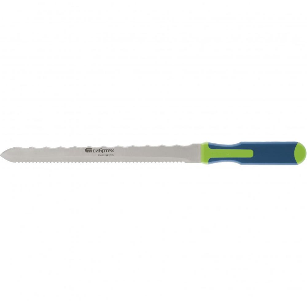 Нож Сибртех 79027 общей длиной 420 мм, с обрезиненной рукояткой и 2-сторонним лезвием длиной 280 мм, используется для резки длинных и толстых теплоизоляционных панелей. Полотно имеет две режущих кромки, что удобно для работы с разными типами материалов.