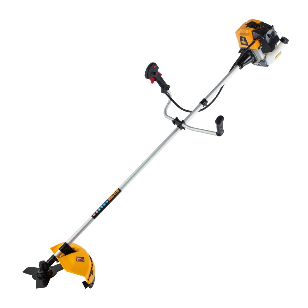 Бензиновый триммер Denzel DR-52 96275 с двигателем объемом 52 см3 и неразъемной штангой состоит из 2 частей и предназначен для ухода за газоном и формирования у него ровных границ, скашивания травы различных типов, в том числе с жесткими стеблями (полынь, крапива, лебеда). Эффективное решение этих задач обеспечивают режущие насадки — трехлопастный нож из стали и усиленная катушка из полиамида с леской. Они вращаются со скоростью 9500 об/мин, ширина скашивания составляет 25,5 и 42 см. Данная модель является самой производительной из линейки DR. Двигатель мощностью 3 л.с. обеспечивает уверенную работу даже на сложном рельефе.