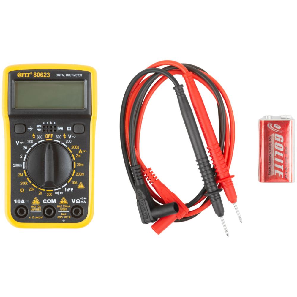 Подает звуковой сигнал в режиме целостности электроцепи. Индикация разряда батареи. Батарея 9 В и провод с наконечником и щупом в комплекте. Мягкий протектор с подставкой для защиты мультиметра и удобства использования. Диапазон измерения напряжения постоянного тока 0,1 мВ - 600 В. Диапазон измерения напряжения переменного тока 100 мВ - 600 В. Диапазон измерения величины постоянного тока 0,1 мкА - 10 А. Диапазон измерения сопротивления цепи постоянному току 0,1 Ом - 2 МOм