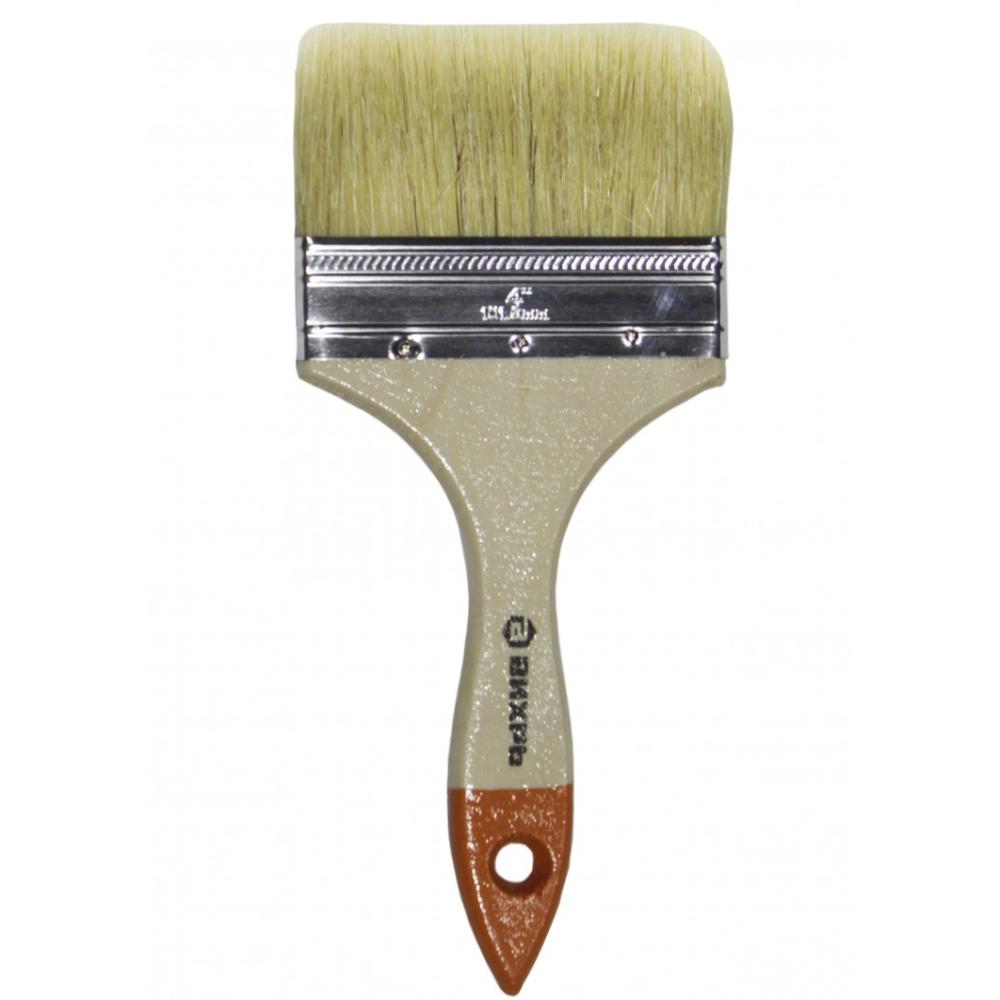 Кисть ВИХРЬ СТАНДАРТ 100 мм 4" - удобный инструмент для малярных работ: окрашивания любых поверхностей. Щетина из натурального материала, что позволяет делать забор краски и эффективно обрабатывать неровные и шероховатые материалы. Рукоятка деревянная, не скользит в руке, есть отверстие для размещения и хранения.