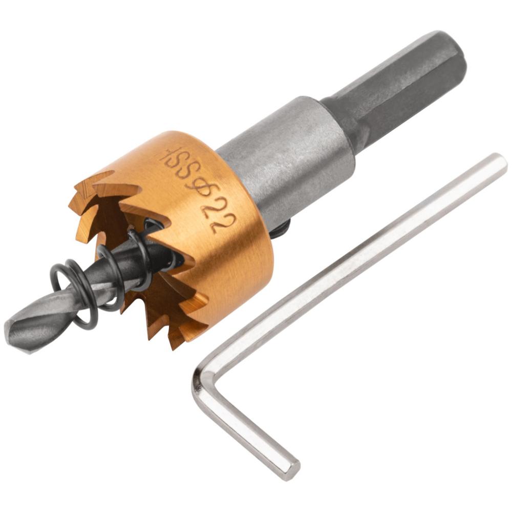Для сверления отверстий в стали, цветных металлах и пластике. Максимальная глубина сверления 25 мм. Трехгранный хвостовик. Материал: центрирующее сверло из быстрорежущей (HSS) стали, коронка из быстрорежущей (HSS) стали с титановым покрытием, хвостовик из инструментальной стали. Упаковка: пластиковая туба.