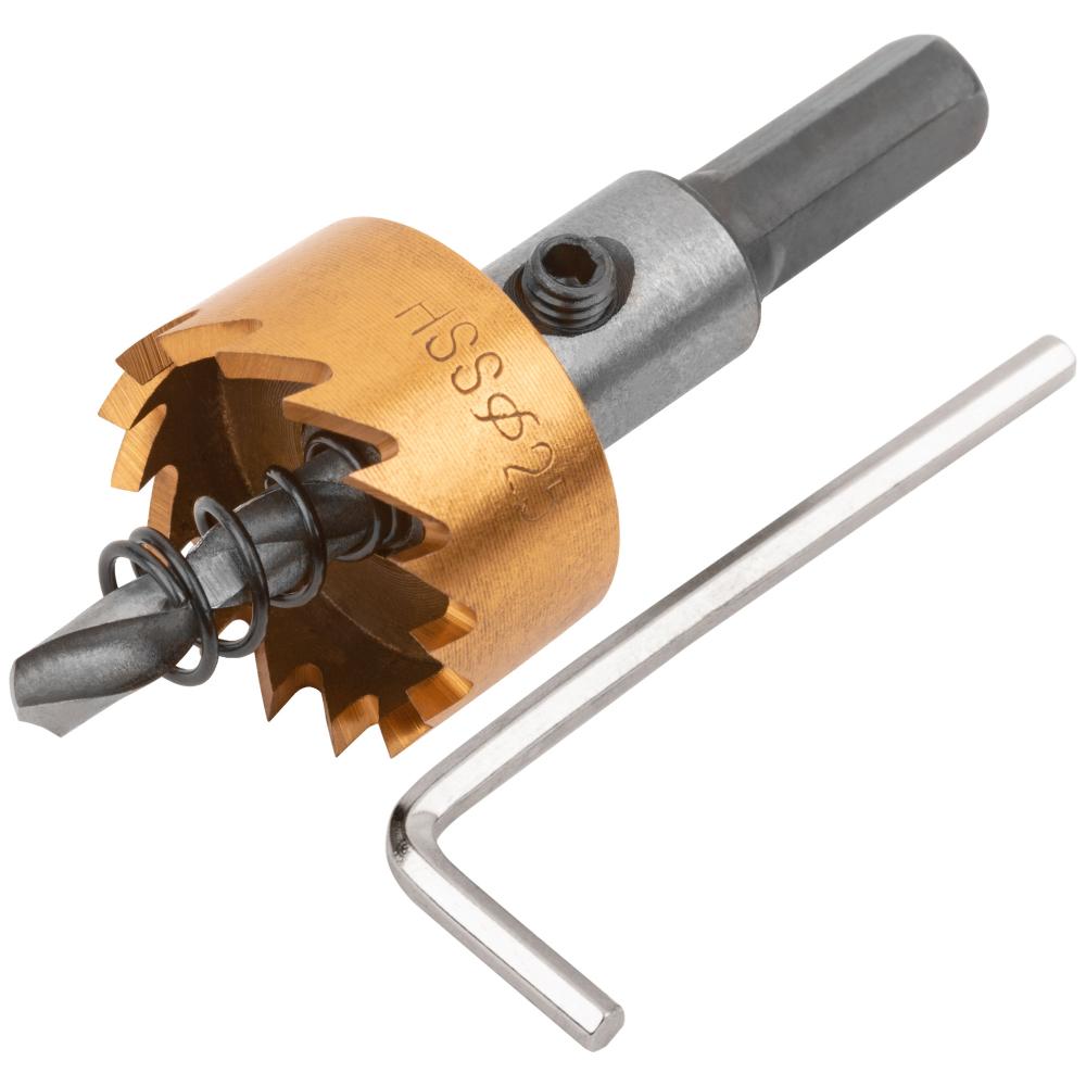 Для сверления отверстий в стали, цветных металлах и пластике. Максимальная глубина сверления 25 мм. Трехгранный хвостовик. Материал: центрирующее сверло из быстрорежущей (HSS) стали, коронка из быстрорежущей (HSS) стали с титановым покрытием, хвостовик из инструментальной стали. Упаковка: пластиковая туба.