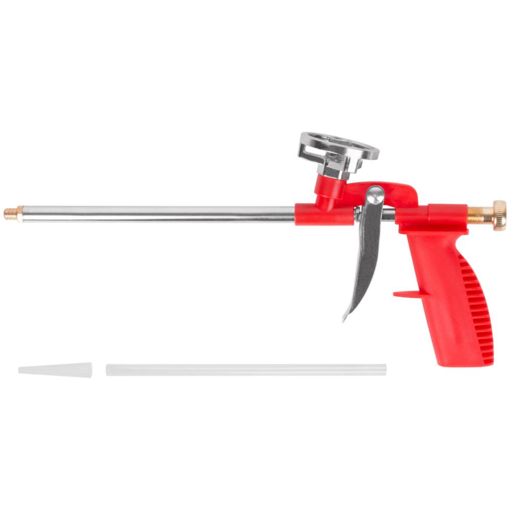 Пистолет для монтажной пены КУРС предназначен для заполнения полостей, трещин, отверстий в различных материалах при проведении монтажных, строительных, ремонтных работ. Подающая трубка сделана из нержавеющей стали, игольчатый клапан выполнен из алюминиевого сплава, рукоятка и корпус выполнены из пластика. Пластиковые части пистолета легко чистятся. Регулировочный винт с плавным ходом позволяет точно настраивать объем подачи пены и оптимизировать ее расход. Малый вес пистолета не утомляет руку во время продолжительных работ.
