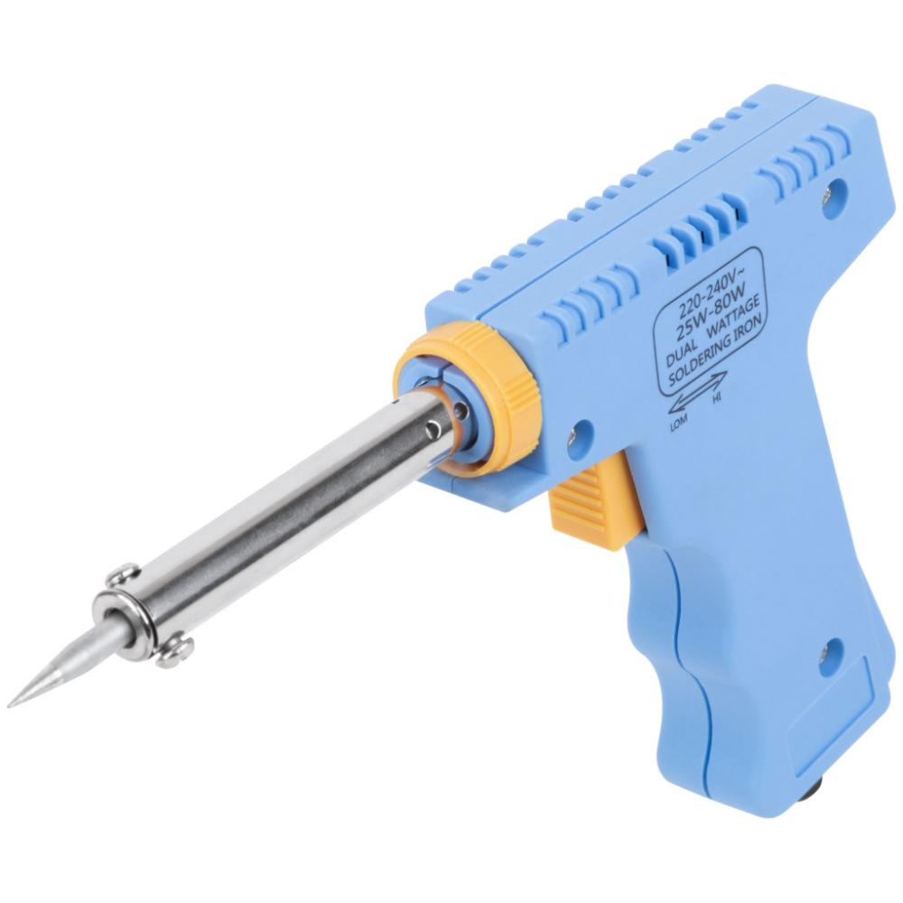 220 В, два режима работы 25/80 Вт. Сменное медное жало с долговечным защитным покрытием. Для нагрева деталей, лужения и пайки электрических схем, электротехнических изделий и компонентов при помощи легкоплавких припоев. Паяльник работает в двух режимах мощности. При отпущеной кнопке (курке) паяльник работает в режиме 25 Вт. Нажатие и удержание кнопки (курка) активирует режим 80 Вт.Материал: инструментальная сталь, пластиковый корпус. Упаковка: блистер.