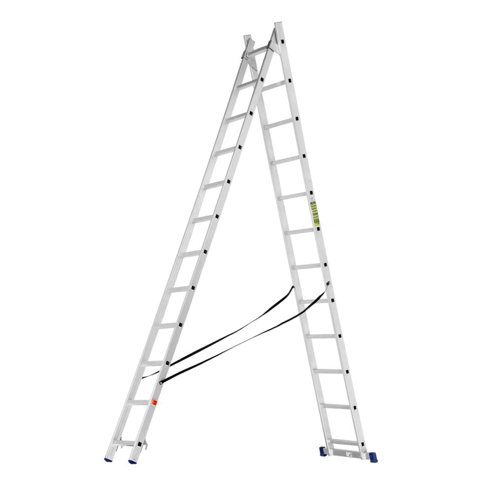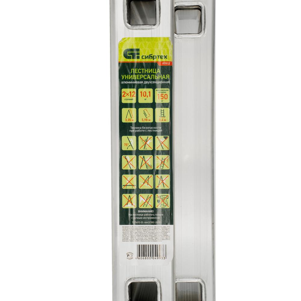 Алюминиевая двухсекционная лестница Сибртех 97912 состоит из 2-х секций по 12 ступеней каждой. Легкая и прочая применение, она используется в качестве двух стремянок, встречается для бытового и полупрофессионального.