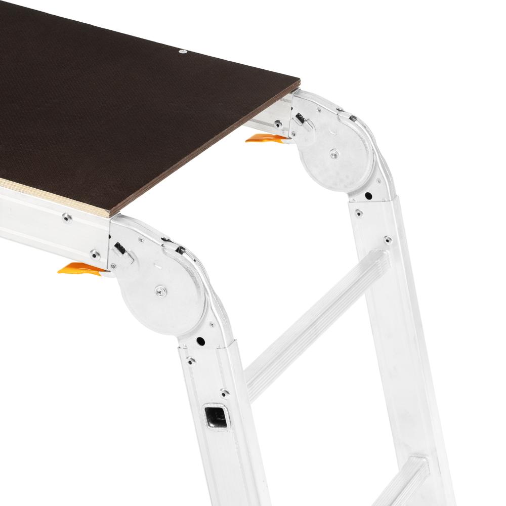 Надежность — стойки и ступени изготовлены из прессованного алюминиевого профиля, рабочая площадка из антисептированной фанеры устойчива к воздействию микроорганизмов и насекомых.