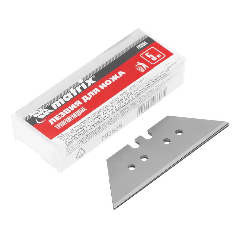 Прямые трапециевидные лезвия Matrix 793555 шириной 19 мм и длиной 61 мм, 5 шт. в упаковке, — сменные элементы для строительных ножей Matrix арт. 78924, 78964, 78900, 78967. Благодаря остро заточенным режущим кромкам они подходят для разрезания линолеума, картона, пластика, гипсокартона, раскройки обоев. Используются в профессиональной и бытовой сфере.