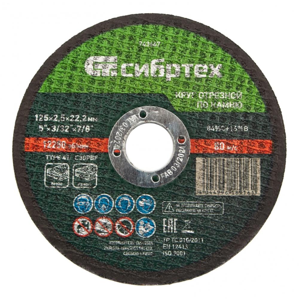 Отрезной круг по камню Сибртех 743667, 125 х 2,5 х 22,2 мм, используется в качестве оснастки на УШМ для сухого реза камня, огнеупорного кирпича, бетонных изделий, керамической плитки. Высокая производительность позволяет использовать круг как в быту, так и в частной мастерской или на небольших производствах.
