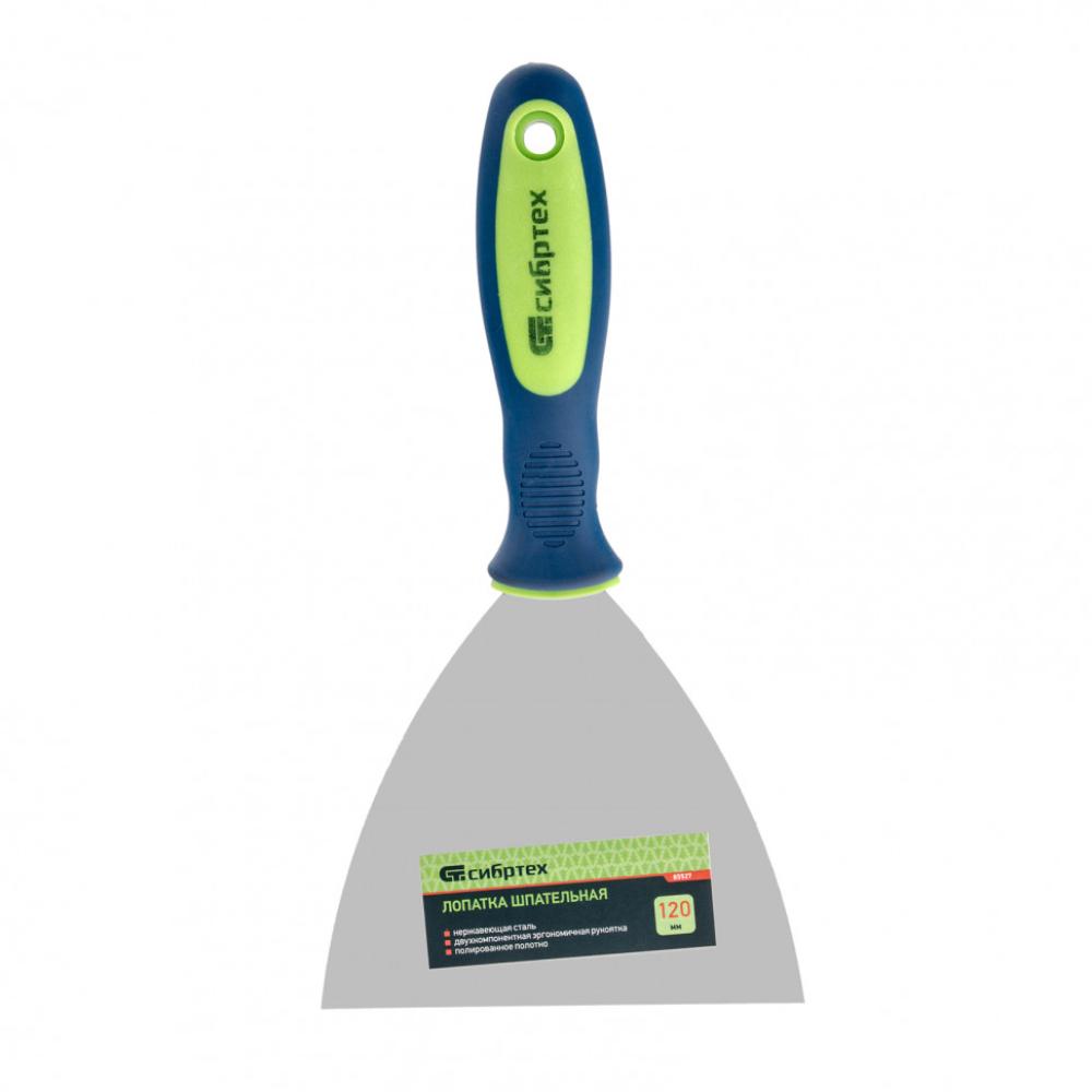 Шпательная лопатка Сибртех из нержавеющей стали 85527, шириной 120 мм, с 2-компонентной ручкой, облегчает проведение ремонтно-отделочных работ. Позволяет наносить и разравнивать строительные смеси, шпаклевать швы, заполнять трещины и удалять старые обои.