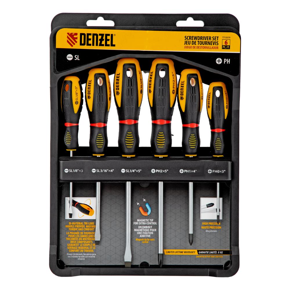 Набор Denzel 7713379 состоит из 6 отверток с трехкомпонентными рукоятками, изготовленных из стали CrV и предназначенных для монтажа и демонтажа резьбовых соединений. В наборе отвертки наиболее популярных типоразмеров для эффективной работы с крепежом типа PH и SL. Намагниченные фосфатированные шлицы обеспечивают улучшенное сцепление с головкой крепежа, что упрощает и ускоряет работу. Набор пригодится дома, в мастерской и гараже.