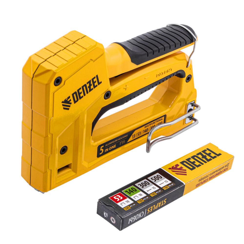 Мебельный степлер Denzel 40215 совместим со скобами типа 53 и 13 размером 6-14 мм, типа 140 размером 10-14 мм, а также с гвоздями типа 300 размером 15 мм и штифтами типа 500 размером 15 мм. Предназначен для фиксации листовых материалов на деревянном основании. Используется для крепления фанеры, ДСП, ДВП, картона, оргалита, изоляционного материала, а также для укладки напольных покрытий, обивки мебели и выполнения багетных работ.