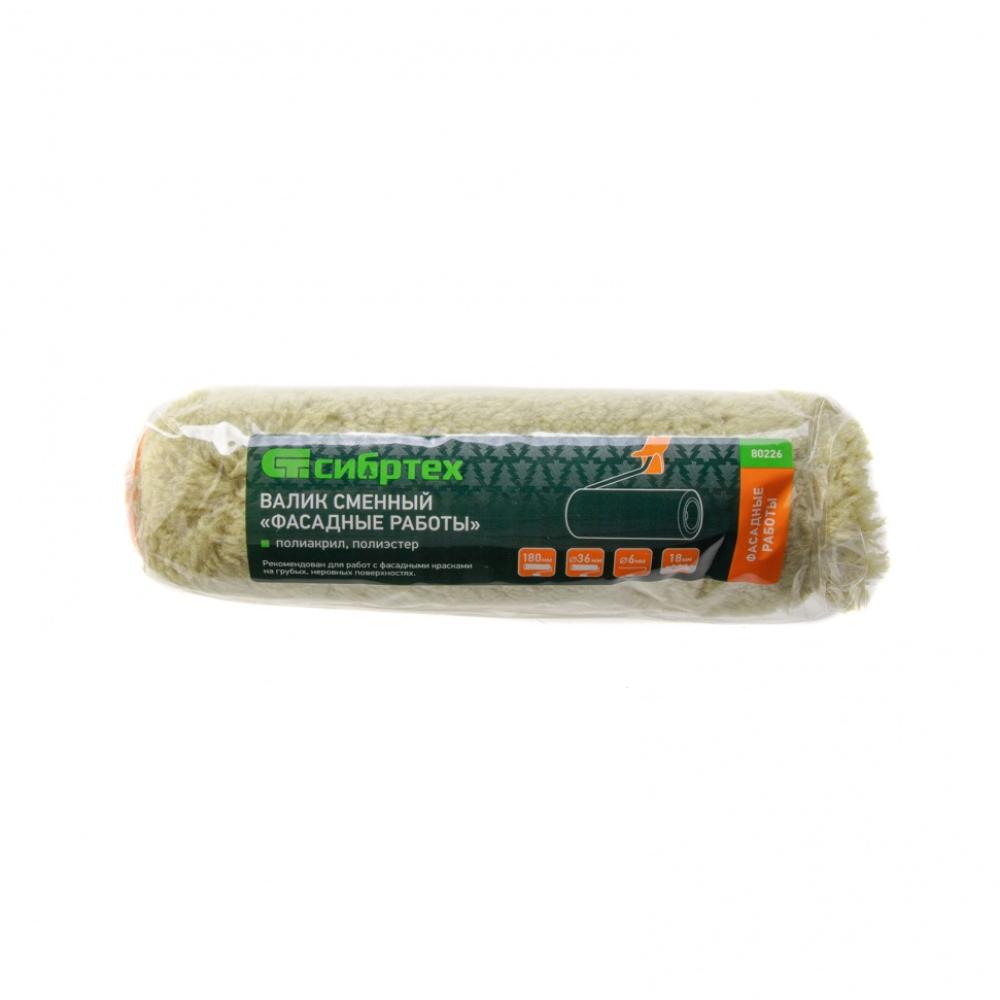 Сменный валик Сибртех «Фасадные работы» 80226 с ворсом 18 мм из полиакрила и полиэстера, роликом 180 х 36 мм, предназначен для установки на ручку диаметром 6 мм. Его используют при проведении фасадных работ для нанесения ЛКМ на грубые участки с неровностями.