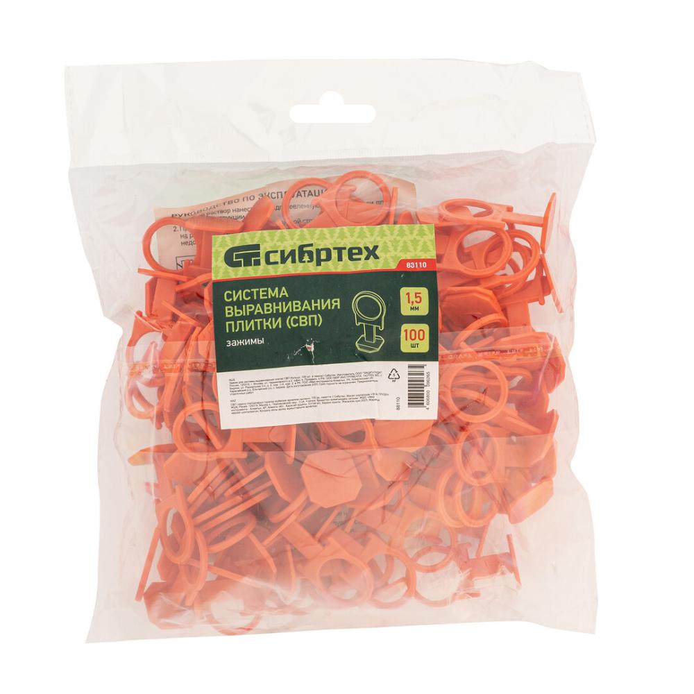 Система выравнивания плитки Сибртех СВП Кольцо 88110 состоит из зажимов (100 шт. в пакете), используемых совместно с клиньями. Позволяет добиться качественного результата: межплиточные швы получаются ровными и аккуратными, керамическая/керамогранитная плитка не смещается. Зажимы предназначены для формирования швов шириной 1,5 мм. Клинья приобретаются отдельно (артикулы 88050, 88071).