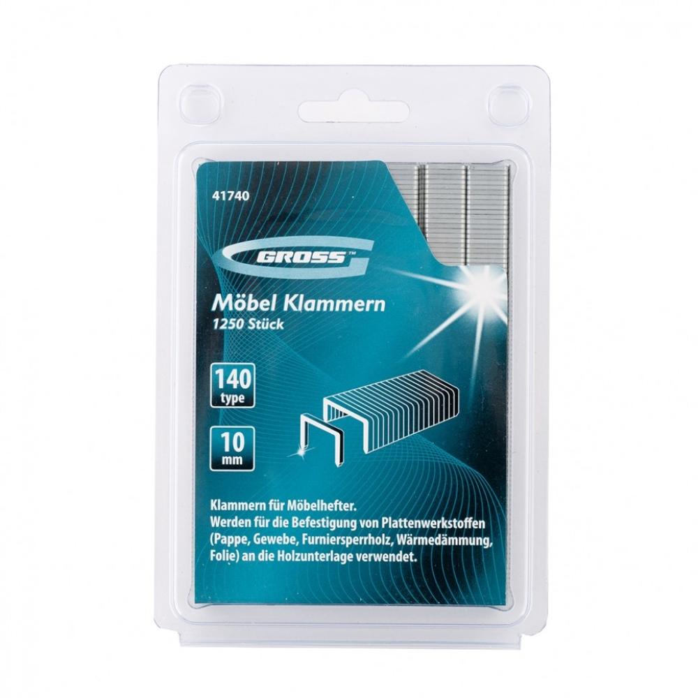 Усиленные скобы Gross 41740 10 х 10,5 х 1,2 мм, тип 140, 1250 шт., необходимые для скрепления листовых материалов с помощью мебельного степлера. Ими можно зафиксировать картон, фанеру, ткань в процессе обработки или ремонтных работ.