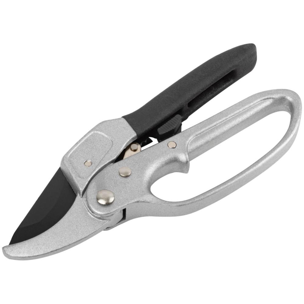Режущая кромка встык с упорной наковальней. Храповый механизм дожима для большего усиления при резке. Для обрезания побегов и веток диаметром до 22 мм. Материал: корпус из алюминиевого сплава, лезвие из высокоуглеродистой стали с тефлоновым покрытием, ПВХ накладка на ручку.
