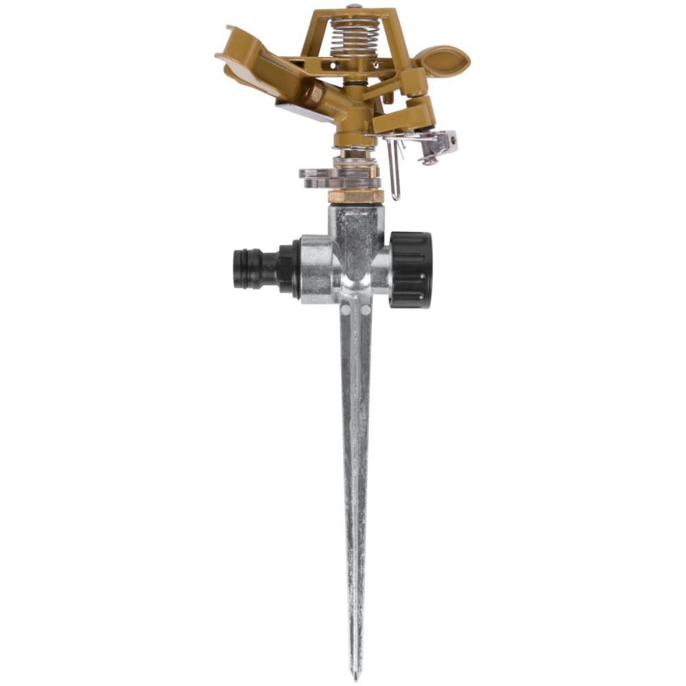 Усиленный металлический корпус. Импульсный. На пике. Два соединительных гнезда обеспечивают использование в цепи из нескольких распылителей. Подключается к шлангу при помощи универсального соединителя. Регулировка длины струи и регулировка поворота головки от 20° до 360° позволяют орошать заданный участок. Радиус разбрызгивания до 12 м. Материал: цинковый сплав, нержавеющая сталь, медь, пластик. Упаковка: картонный подвес.