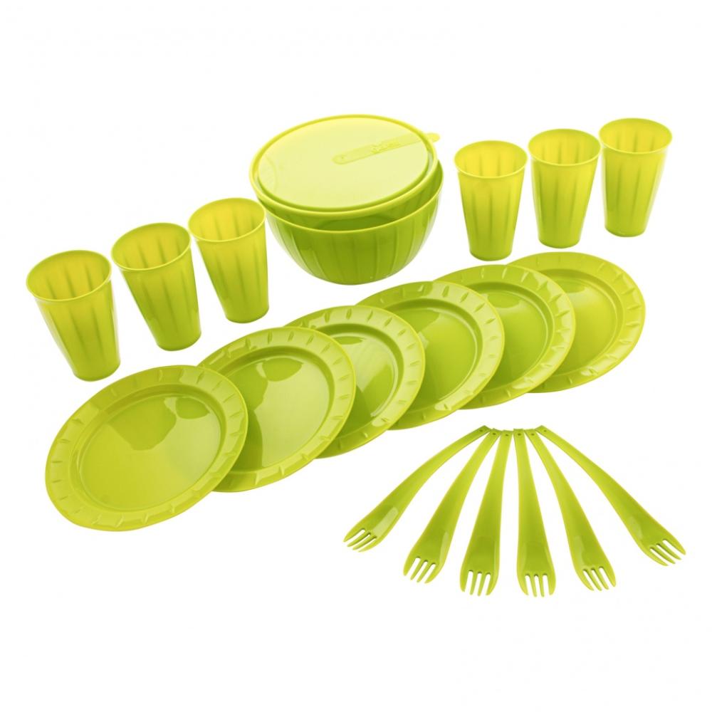 В состав набора входит оптимальный комплект посуды: салатник, плоские тарелки, стаканы и вилки.