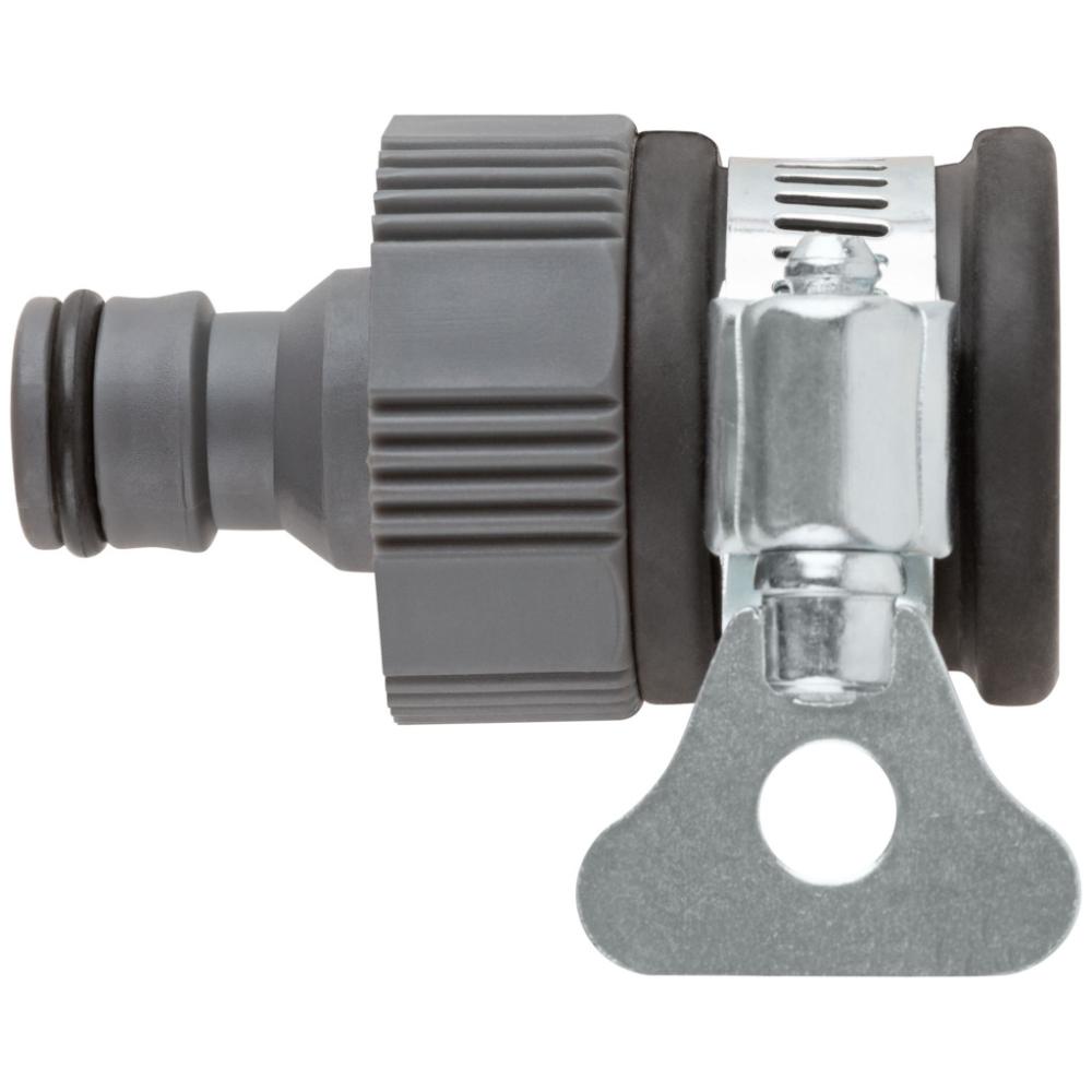 С хомутом. Для соединения поливочных шлангов разных диаметров с водонапорными трубами (в том числе безрезьбовыми), диаметром 3/4 (17-20мм), через универсальное быстросъемное соединение. Материал: резина, пластик, хомут из инструментальной стали. Упаковка: блистер.