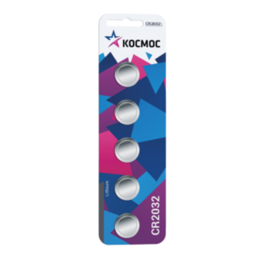 Литиевая батарейка CR2032 5хBL КОСМОС KOC20325BL используется для питания наручных часов, пультов дистанционного управления, светодиодных фонарей, материнской платы на компьютере и другой техники.