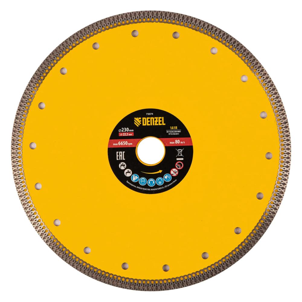 Алмазный диск ТМ Denzel "Сплошной" арт 73074, ф230 х 22,2 мм, предназначен для резания мрамора, керамогранита и керамическую плитки, камня. Устанавливается на УШМ (болгарку) или плиткорез с посадочным диаметром 22,2 мм. Высокая концентрация алмазов и супертонкая рабочая часть диска обеспечивает идеальную частоту кромок и высокую скорость реза. Особая сплошная форма режущей части позволяет использовать диск без водяного охлаждения для кратковременного реза. Диск произведен по технологии горячего прессования с увеличенной шириной режущей кромки (10мм) подходит для профессионального использования и больших объемов работ. При интенсивной резке необходимо использовать водяное охлаждение.