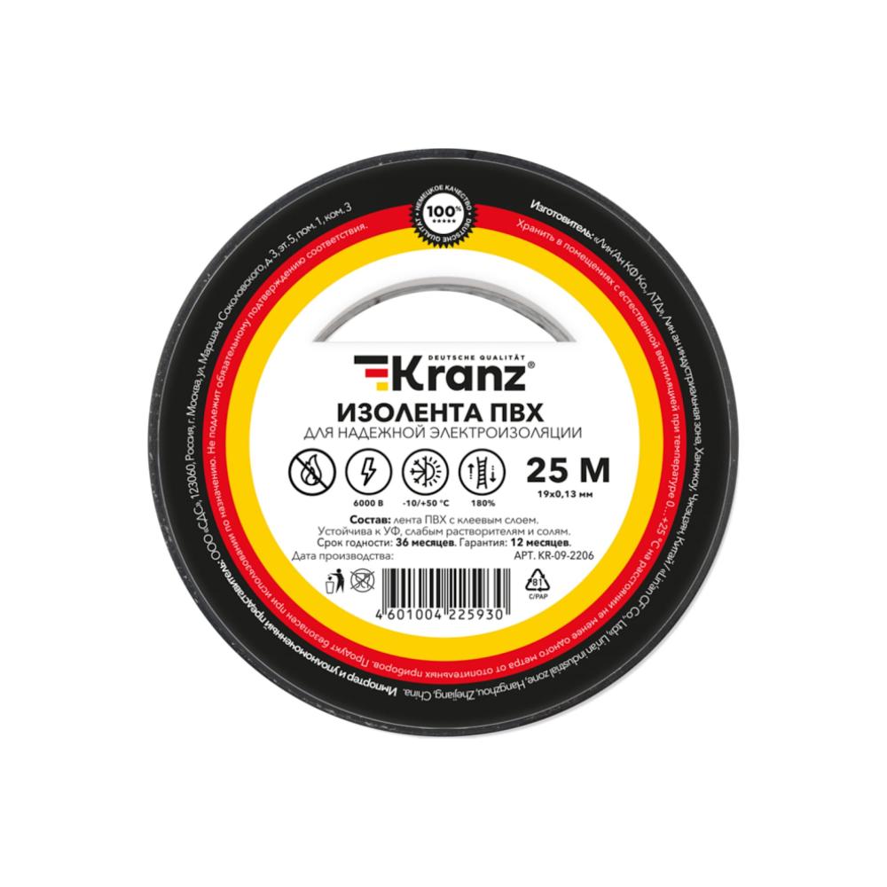 Изолента ПВХ KRANZ 19 мм х 25 м, 0.13 мм, черная KR-09-2206 предназначена для электрической изоляции, цветной маркировки, соединения, защиты от внешних факторов и герметизации кабелей, проводов и шнуров. Обеспечивает высокое качество обмотки и защищает места соединения от влаги, пыли, грязи, механических повреждений и перепадов температуры окружающей среды. Выполнена из высококачественной ПВХ-пленки с клеевым слоем.