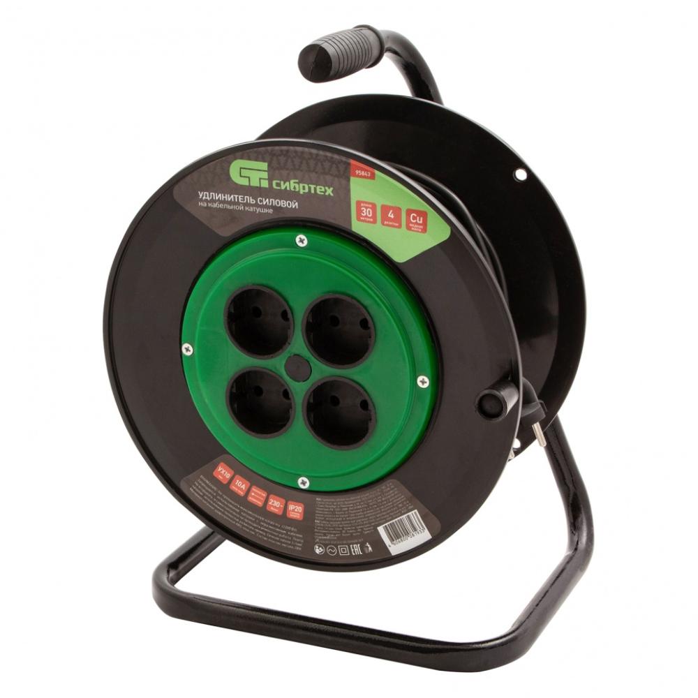 Силовой удлинитель на кабельной катушке Сибртех 95843 типа УХ10, с кабелем ПВС длиной 30 м и 4 розетками без заземления, рассчитан на силу тока 10 А и предназначен для подключения к удаленному источнику питания электроприборов суммарной мощностью не более 2200 Вт. Удобная рукоятка облегчает разматывание и сматывание кабеля. Сетевой удлинитель пригодится для работы с инструментом на строительной площадке, дачном участке, в автомастерской.