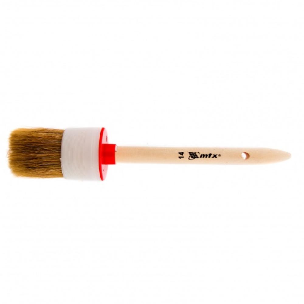 Круглая кисть MTX №14 (50 мм) 82084 с натуральной щетиной и деревянной ручкой пригодится в быту для окрашивания узких длинных поверхностей. Светлая натуральная свиная щетина с добавлением искусственной обладает высокой износоустойчивостью и может использоваться для нанесения красок с содержанием растворителей, а также масляных красок и лаков.