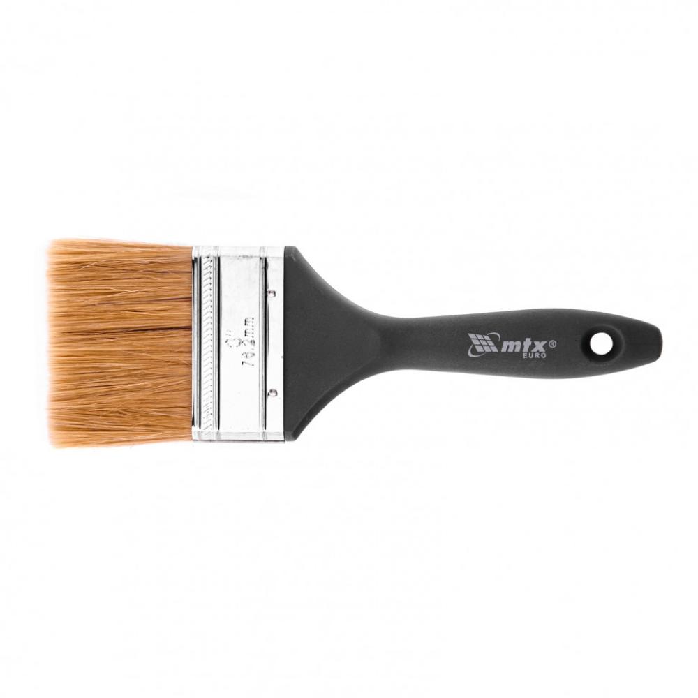 Плоская кисть MTX «Евро» 83066 шириной 3 дюйма, с натуральной щетиной и пластмассовой ручкой, используется для профессионального окрашивания поверхностей. Рекомендуется для нанесения агрессивных ЛКМ с содержанием растворителей.