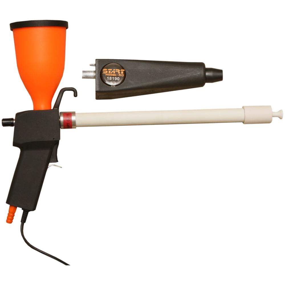 Комбинированный пистолет "Старт-50-комби" с воронкой и двумя стволами в комплекте – трибостатическим и электростатическим. Позволяет работать как в режиме трибостатики, так и в режиме электростатики в зависимости от поставленных задач и конфигурации изделия.
