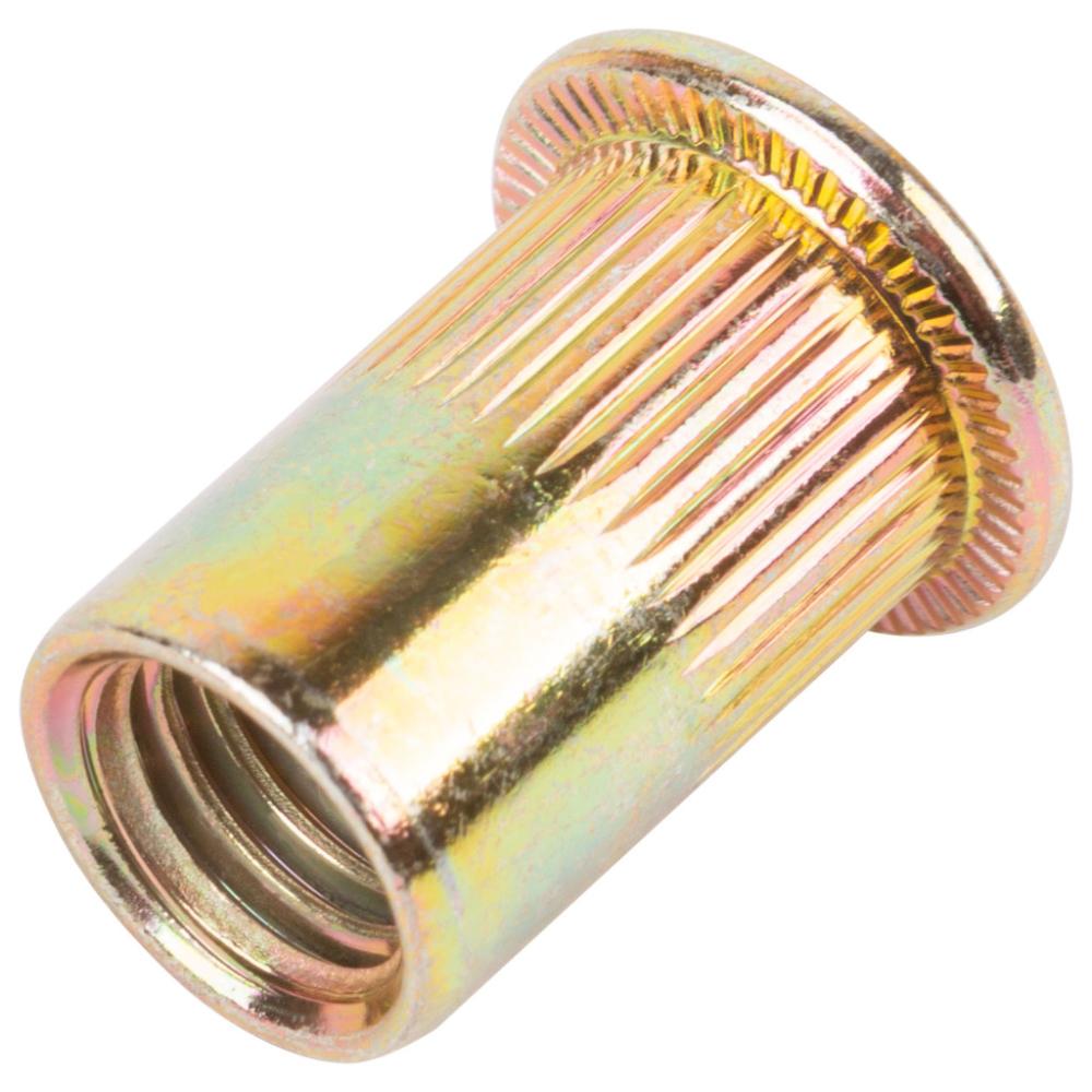 Стальная резьбовая заклепка с насечками и стандартным цилиндрическим бортиком, покрытие цинк. Применяются для скрепления тонколистовых материалов с получением в точке скрепления внутренней резьбы и последующего монтажа прикрепляемого материала. Упаковка: п/э пакет с подвесом.