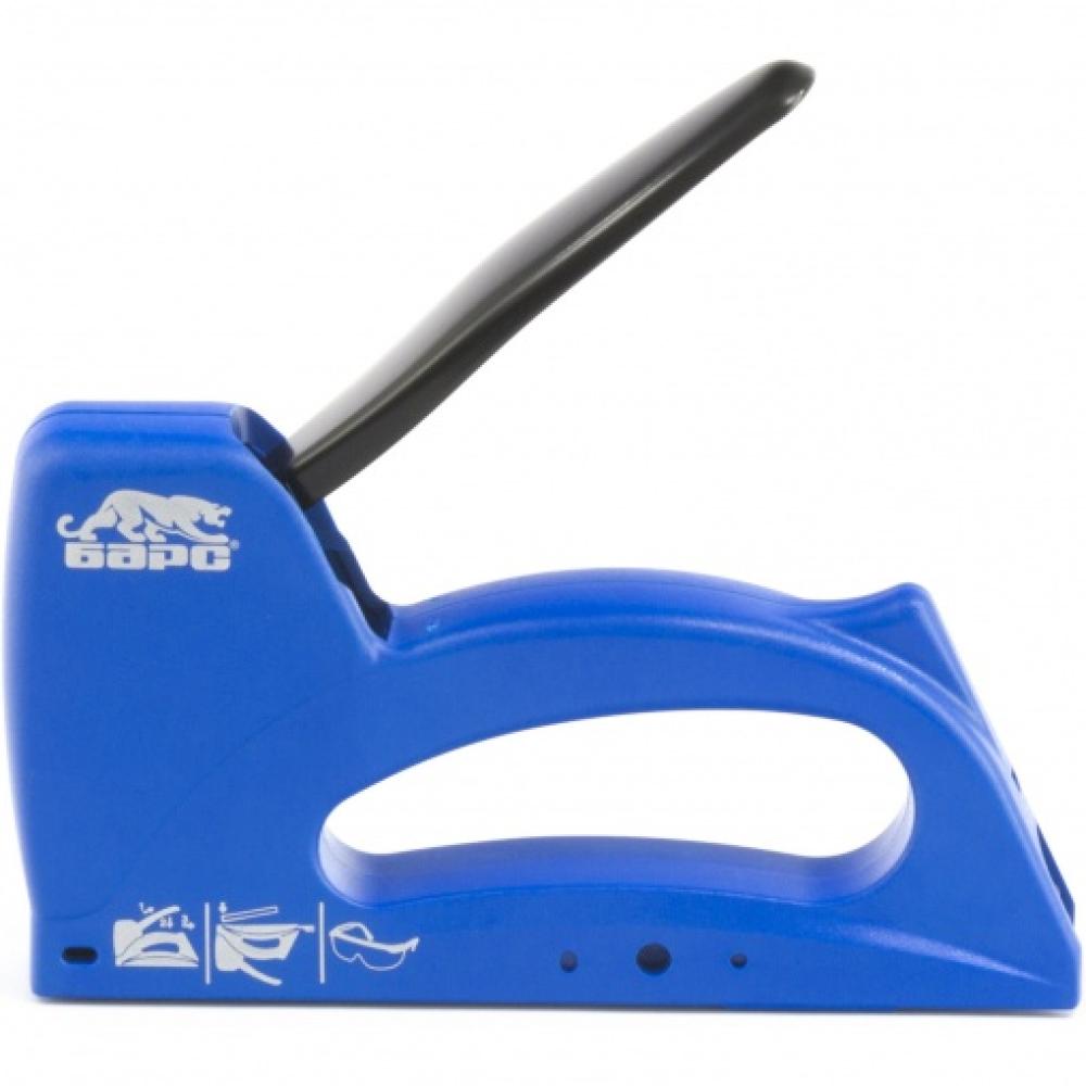 Пластиковый степлер Барс 40001 работает со скобами типа 53 размером 6-10 мм и предназначен для быстрого крепления листовых материалов к основаниям из древесины, ДВП или ДСП. Используется для сборки и обивки мебели, закрепления изоляционных материалов. Ударный механизм рессорного типа не требует прикладывания повышенных усилий, поэтому продолжительная работа с инструментом не вызывает дискомфорт.