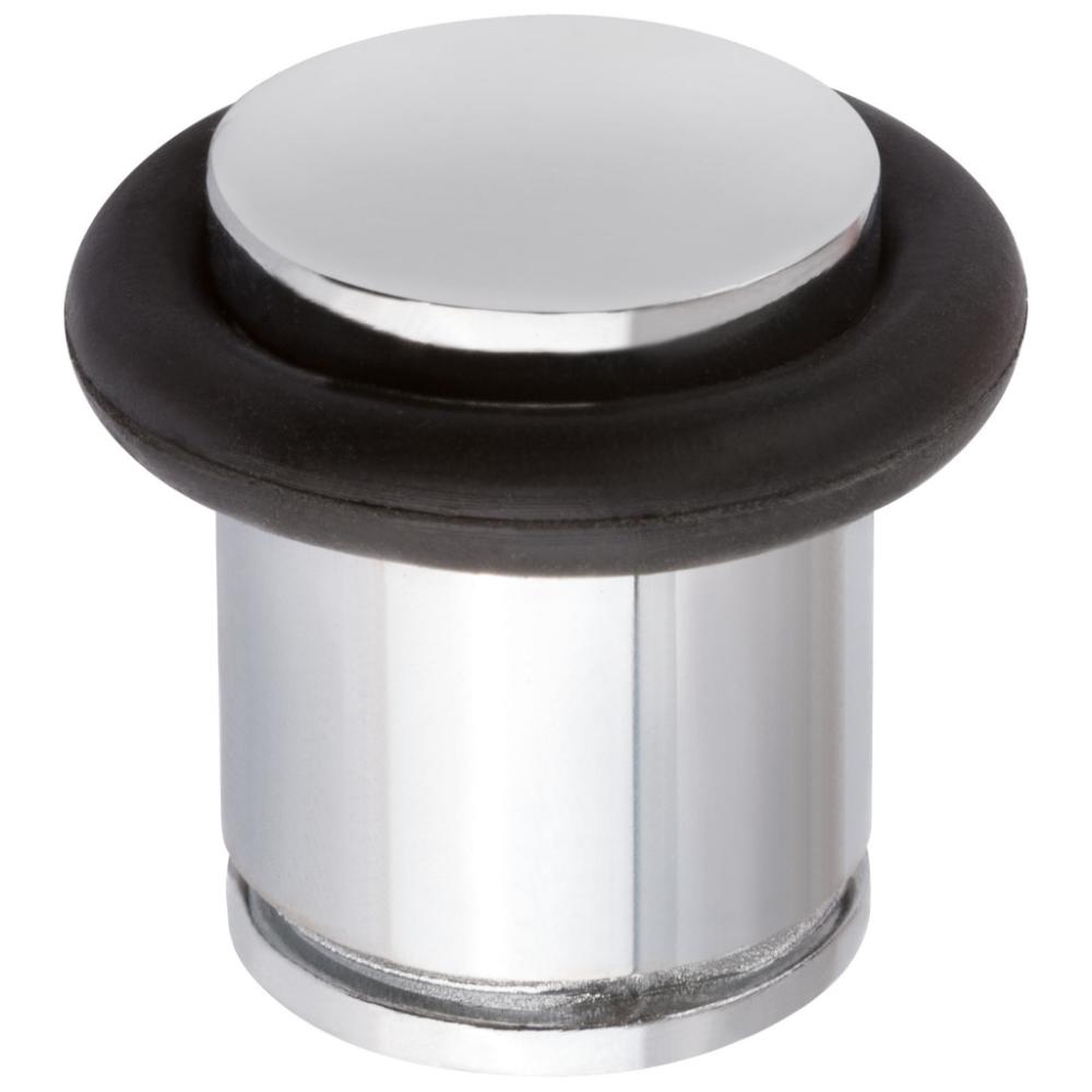 Ограничитель дверной напольный. Цилиндрическая форма. Крепежный шуруп в комплекте. Материал: сплав ЦАМ, гальваническое покрытие, резиновое кольцо.