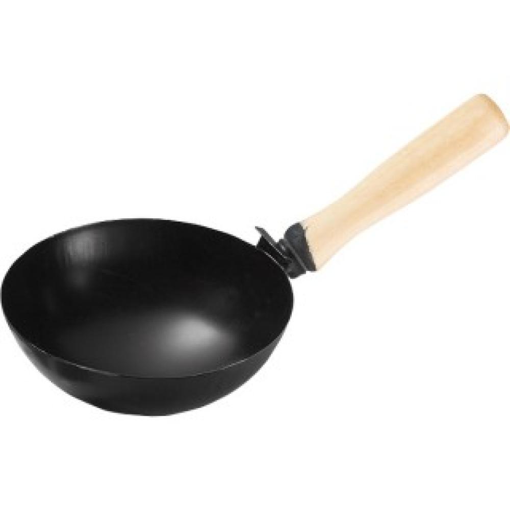 Стальной ковш в форме полусферы с деревянной ручкой.