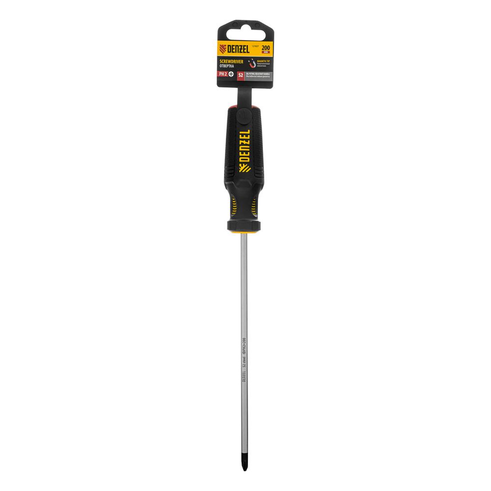 Отвертка Denzel 121827 с трехкомпонентной рукояткой, со стержнем из стали S2, длиной 200 мм, предназначена для закручивания и откручивания резьбового крепежа типа PH2. Высокоточный намагниченный шлиц избавляет мастера от необходимости придерживать винт или саморез рукой. Отвертка рекомендована для профессионального использования.