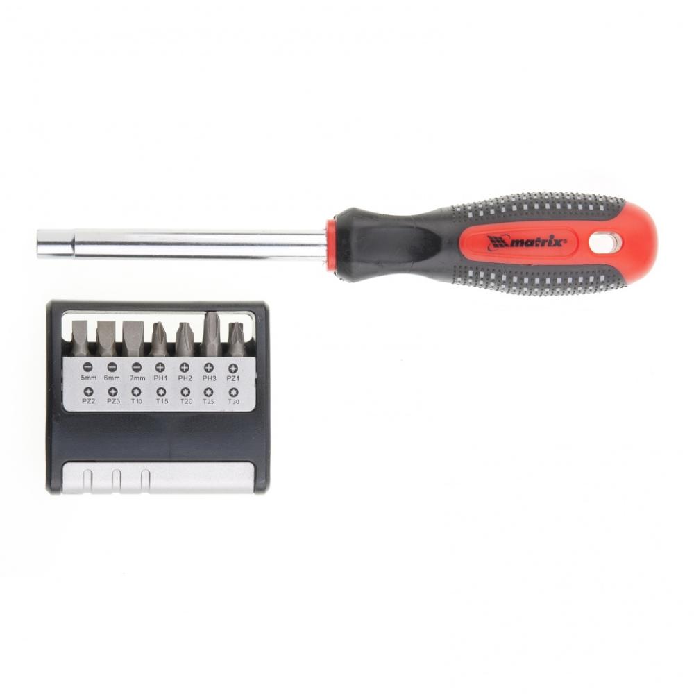 Отвертка Matrix 11337 с набором бит из 14 шт. из стали CrV служит для откручивания и закручивания резьбовых крепежей со шлицами SL, PH, PZ и Torx. Заменяет комплект стандартных отверток. Присоединительный шестигранник с магнитом надежно удерживает биту, не давая ей выскочить во время работы. Набор подходит для профессионального и бытового применения.