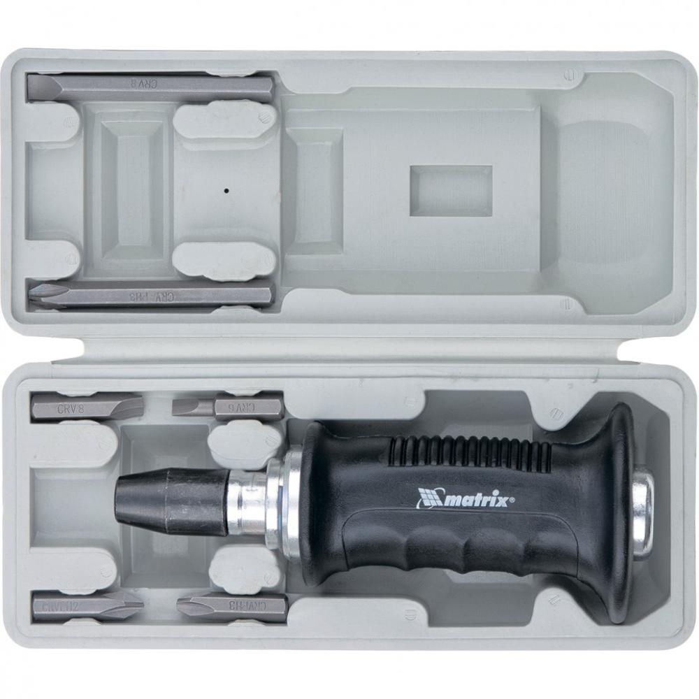 Ударно-поворотная отвертка Matrix 11561 с черной ручкой, с присоединительным шестигранником 1/2 дюйма, с набором бит из 6 шт., в пластиковом кейсе, предназначена для работы с резьбовыми соединениями, в том числе для демонтажа перетянутых или заржавевших крепежей. Имеет металлический затыльник, выдерживающий удары молотком. Используется при ремонте оборудования и автотехники, рекомендована для профессионального применения.