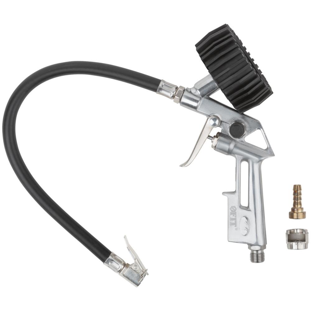 Пистолет с манометром, до 6 атм, 0,1 атм. Материал: алюминий. Cоединение байонет. Измерительная шкала до 6 атмосфер, с шагом 0,1 атмосферы, диаметр выходного отверстия (ниппель) 1/4”, поперечное расположение манометра. Используется для контроля давления при подаче воздуха.